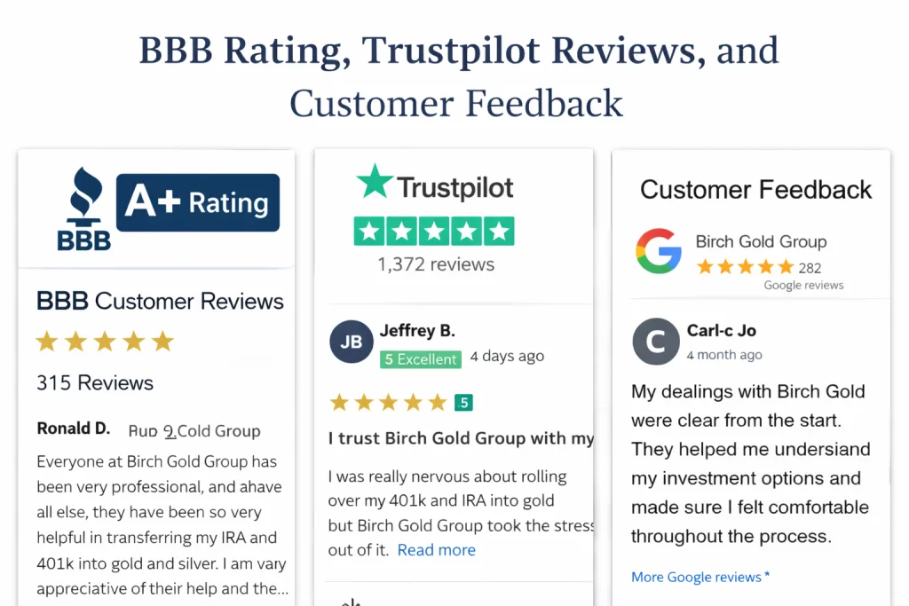 Across major review platforms, Birch Gold Group is commonly praised for educational support, patient specialists, and smooth IRA rollovers. Some reviews mention premiums and rollover timing.